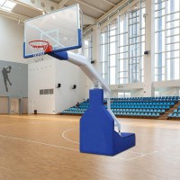 篮球架前立臂、箱体、伸臂配备有专用护套,有效保护运动员免受撞击伤害,后部装有专用配重,单只配重480kg,保证在篮圈根部施加3200N的静载荷时,篮球架不倾翻。前立臂与伸臂间装有专用保险机构,有效保证使用时的安全性及稳定性。