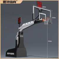 篮球架的结构主要由篮板、支腿和篮筐三部分组成。支腿与地面呈固定的90度角,通过支撑杆和底座紧固,篮板与篮筐通过紧固件连接在支腿上,使球员投篮时具有稳定性和安全性。