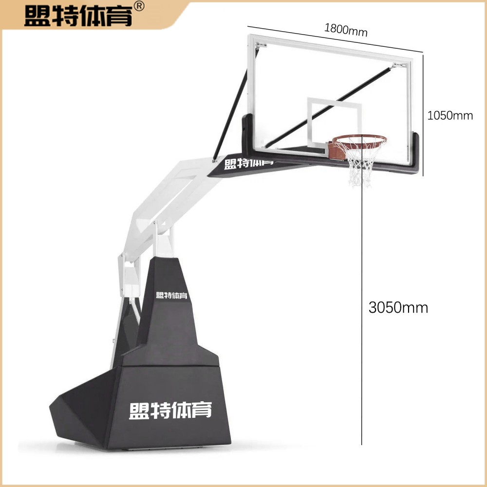 第三;另外箱体篮球架的箱体为整个篮球架的重心,内部含有配重,箱体的长度一般为1.8-2米,根据篮球架的臂长确认安装的位置,伸臂越长,所需要的后置区域越大。一般篮球架的伸臂长度为1.8米,也就是说箱体距离底线的距离为600mm,场地的宽度要足够安装。